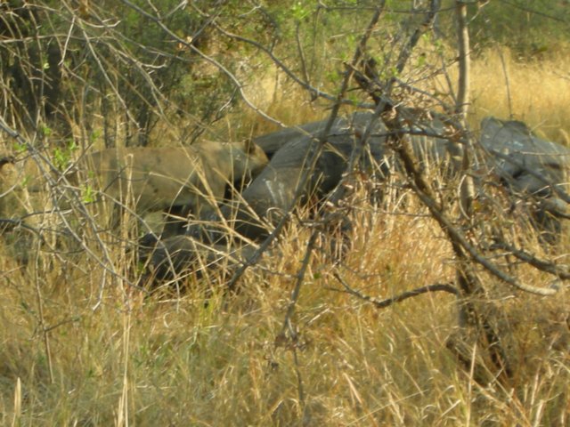 lioness eating from the elephants carcass at Xakanaka, Moremi Wildlife Reserve, Okavango Delta, Botswana
