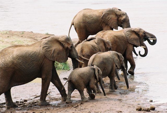 Elephant drinking out of Ewaso Ngiro river, Samburu National Park, Northern Kenya