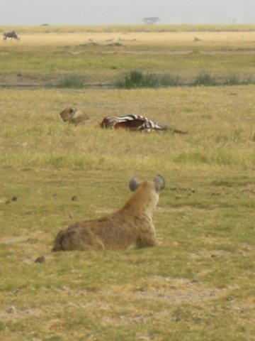 We counted 10 hyenas who wanted some of the zebra the 2 lionesses had for breakfast