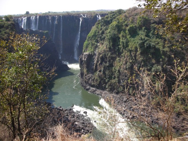 Victoria Falls is like a T, the Zambezi flows away to the left in a surprisingly narrow canyon