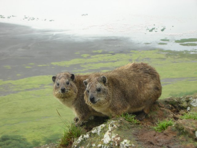 White Rhinoceros, baboons, warthog and flamingos at Lake Nakuru, Kenya